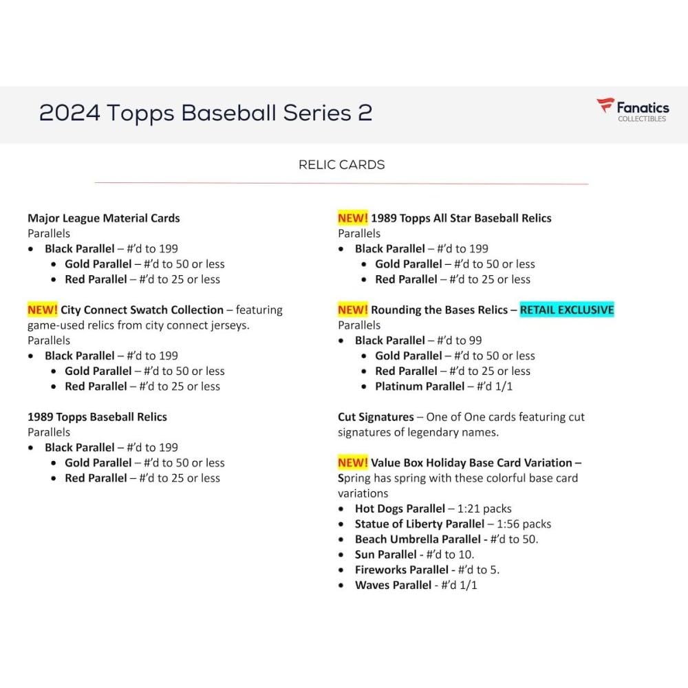 Details: This is a BRAND NEW 2024 Topps Series Two MLB Baseball Factory Sealed RETAIL 20 Pack Box with 20 Packs of 14 Cards for a total of 280 cards per box! Continue the flagship chase with 2024 Topps Baseball Series 2! Collectors will find the league’s current stars, greats from the past, and rising rookies featured on base cards, inserts, and autograph and relic cards. Look for Rookie Cards of Jackson Holliday, Yoshinobu Yamamoto, Shota Imanaga, Steven Cruz, Bryce Jarvis, Carson Spiers, Brenan Hanifee, Hunter Goodman, Joe Boyle, Everson Pereira, Jordyn Adams, Darius Vines, Jackson Wolf, Kyle Hurt, Allan Winans, Austin Wells, Wilyer Abreu and many more! Featuring over a dozen Parallels, including Vintage Stock, Independence Day, Mother's Day, Father's Day, Photo Variation, 1/1 Platinum and RETAIL EXCLUSIVE Royal Blue! Look for NEW Inserts in 2024, including Superstar Blueprint, Grand Gamers, and 2023 Greatest Hits just to name a few!